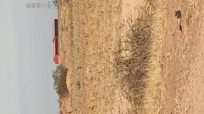 The scene depicts an arid, open landscape in Barakin Columbai, Nigeria, under a hazy, light grey sky. The immediate foreground features bare light brown soil, indicative of a dirt path or track, with sparse dry grass and a small, dark, unidentifiable object resting on the ground in the lower right. A dense, thorny shrub with dark, tangled branches occupies the lower mid-ground, slightly left of center. The central mid-ground is a vast expanse of light brown soil and dried, light-colored crop stubble or dead vegetation, with several small earth mounds visible. In the distant background, two adjacent, rectangular industrial or agricultural buildings are prominent: the left structure possesses a bright red roof and walls, while the right building features a darker red or maroon roof and walls. To the far right in the background, a tall metal lattice electricity transmission tower stands, with power lines extending horizontally across the distant skyline. A small tree with green foliage is positioned between the foreground shrub and the distant structures. No individuals are present in the image.