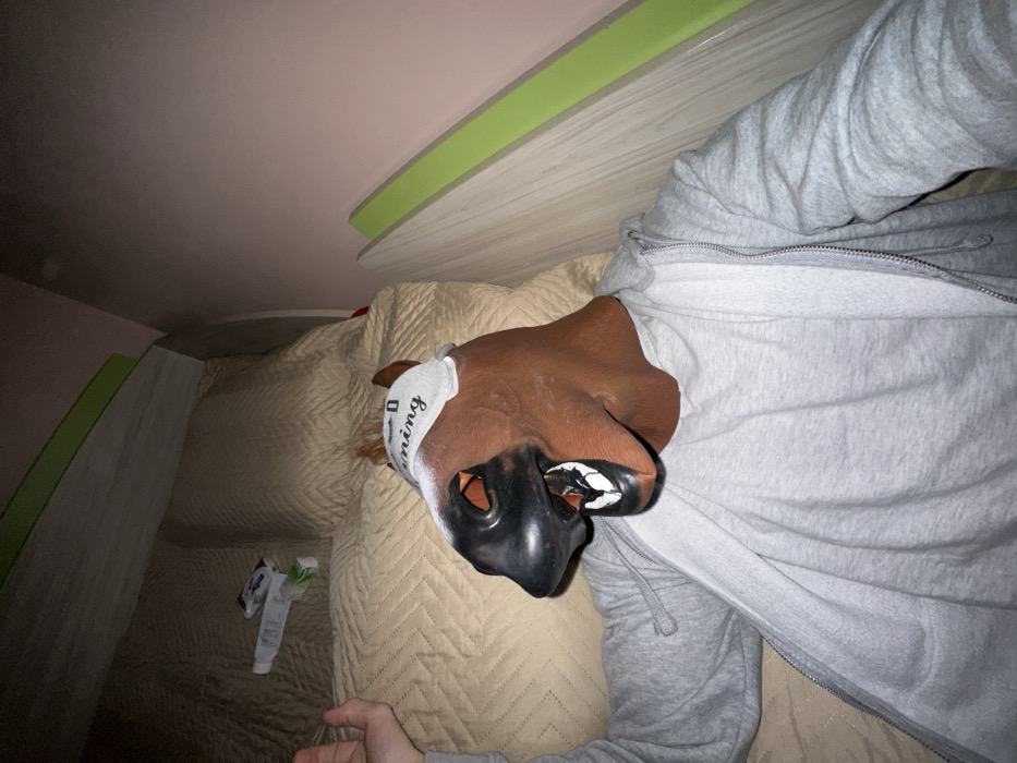 This image captures an individual in an indoor setting, identified as a bedroom in the city of Razgrad, Bulgaria. The subject is wearing a brown horse head mask featuring black snouts and eye openings, and prominent white teeth. A white sleep mask, bearing partial black text reading "D oming," is positioned over the forehead of the horse mask. The individual is dressed in a light grey long-sleeved t-shirt underneath an unzipped grey hooded sweatshirt. The subject is positioned on a bed covered by a light beige quilted bedspread, with two matching pillows visible. On the bedspread, towards the upper left, rests a white tube, consistent with toothpaste or cream, alongside a small piece of white and green packaging. A bare hand with splayed fingers is visible on the left side of the frame, appearing to be part of the subject. The background consists of a light pink wall and light-colored wooden furniture accented with bright green trim. The scene is illuminated by artificial light.