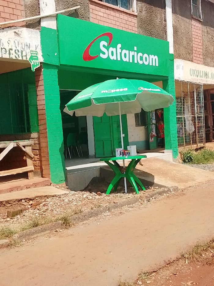 The image displays a commercial street scene in Chevaywa ward, Kenya. A Safaricom agent outlet is central, marked by a prominent green signboard with the "Safaricom" logo in white and a red 'C'. The building's lower facade and pillars are painted green, contrasting with the exposed red brickwork above and on adjacent structures. In front of the Safaricom entrance, a large green outdoor umbrella, branded with "M-pesa", is deployed, shading a small, green plastic table. Several small, multi-colored containers or bottles are present on the table surface. A green, hand-shaped sign pointing left, bearing "SAKIA HAPA" and "M-pesa", is affixed to the building's left side. The Safaricom entrance is a recessed area with green doors. To the immediate left, a partially visible storefront displays "SALON K PESA" and features a wooden structure, likely a stand. To the right, an adjacent building, constructed of red brick with barred windows, has a sign that partially reads "UKULIMA AG...". The foreground consists of an unpaved dirt and gravel road. A narrow, uneven concrete curb separates the road from a strip of ground composed of dirt, small stones, and sparse grass, leading to the concrete foundation of the buildings. No individuals are present, and no specific actions or interactions are depicted in the scene.