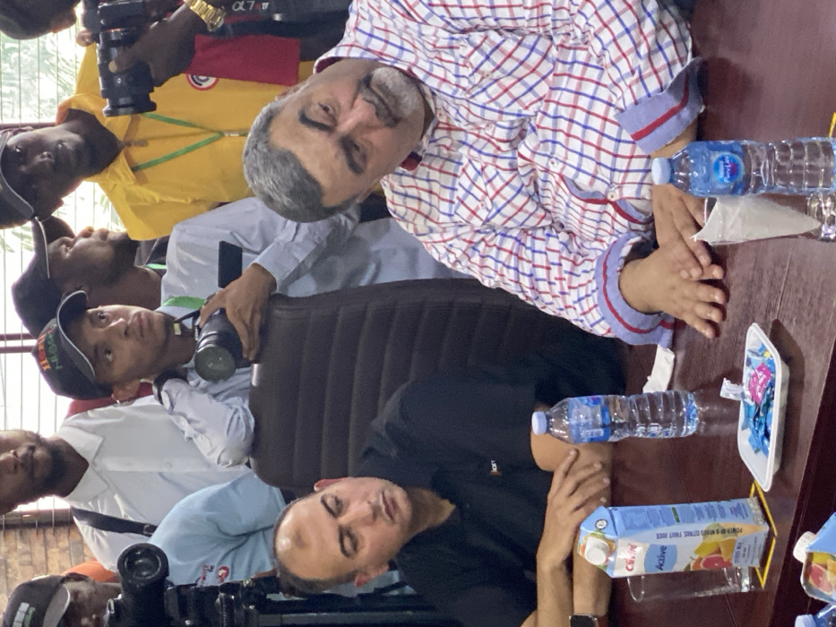 The scene depicts an indoor gathering in Gwagwada, Nigeria. Two men are seated at a dark brown, glossy table in the foreground. The man on the left has light skin, a receding hairline, and wears a black polo shirt, looking to his left. The man on the right has light skin, a grey beard, and wears a red and blue plaid long-sleeved shirt, with his head tilted downwards and to the right, hands clasped on the table. On the table in front of them, from left to right, are a light blue carton of "Chi Active" fruit juice, an empty clear glass, a clear plastic bottle of "Pure Life" bottled water, a small white rectangular tray containing individually wrapped candies, another "Pure Life" bottled water, and a white napkin. In the background, several men are standing. A young man with dark skin wearing a light blue long-sleeved shirt and a black baseball cap with "Hero Nigeria" text is holding a camera with a lens, resting his elbow on the back of a brown, padded chair. Other individuals with dark skin are partially visible; one in a white shirt, another in a yellow shirt with a green lanyard and dark cap, and a third holding a camera on a tripod. The background wall features a reddish-brown brick pattern. The standing individuals appear to be observing or documenting the event.