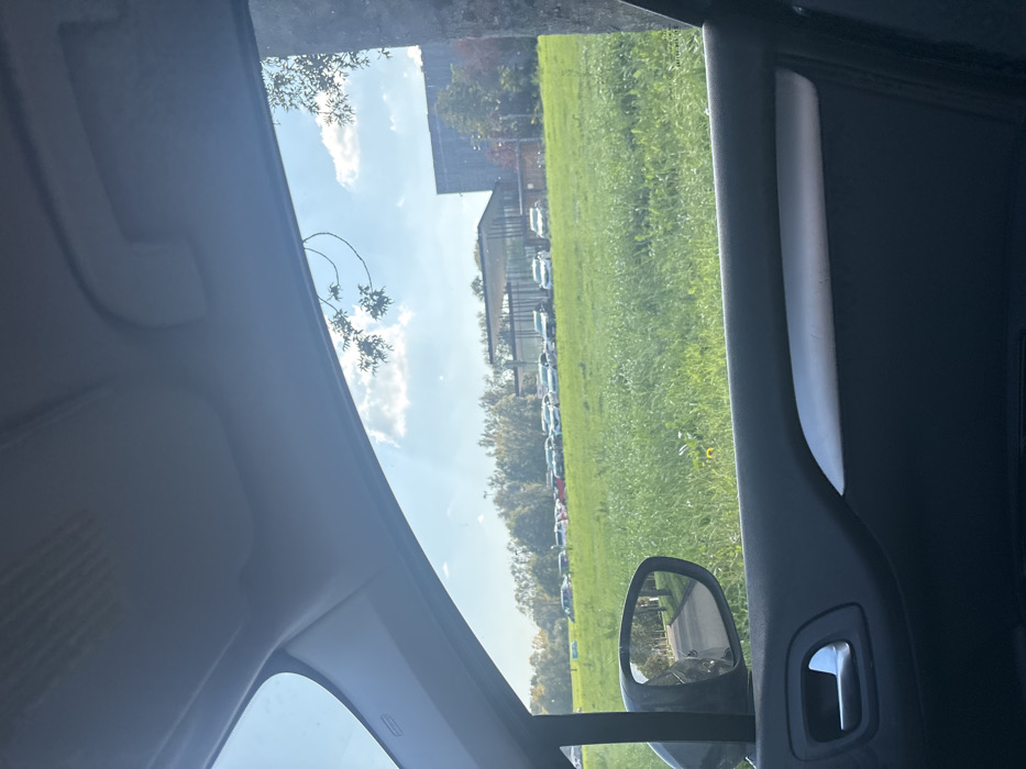 The image presents an outdoor scene in Sélestat, France, viewed from the interior of a vehicle through its passenger-side window. The upper foreground features the light gray headliner and part of the A-pillar, while the lower foreground displays a dark gray door panel with a silver horizontal trim strip and a chrome door handle. The side mirror, visible on the left, reflects a segment of a paved road flanked by trees. The primary view outside the vehicle encompasses a large, level expanse of mown green grass. A single yellow flower, consistent with a dandelion, is visible in the lower-right portion of the grassy area. Beyond the grass, a line of approximately 20 to 30 stationary passenger vehicles, including sedans and SUVs of varying colors (predominantly white, silver, and dark, with some red accents), are parked in rows. In the background, two prominent buildings are visible. To the left, behind the parked vehicles, stands a modern, multi-story building characterized by a distinct roofline and a facade composed of glass and metal elements, identified as the Espace Tanzmatten cultural center. To the immediate right of this structure, a larger, darker, and more utilitarian building with a textured exterior is situated. A dense line of deciduous trees, exhibiting early autumnal foliage, forms the horizon behind the buildings. The sky above is clear blue with scattered white cumulus clouds, indicating bright daylight conditions. No individuals are visible within the frame.