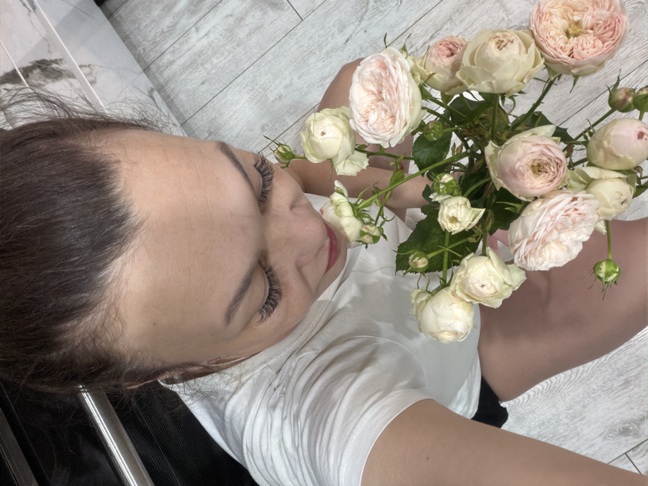 A woman with dark hair poses, her face angled to the camera, showcasing long eyelashes and red lips. She wears a white t-shirt. The background features light wood-patterned flooring and marble textures. In her hands, she holds a bouquet of delicate, pastel-colored roses, with shades of cream, blush pink, and pale yellow. The flowers dominate a portion of the frame, drawing focus with their soft hues and textured petals.