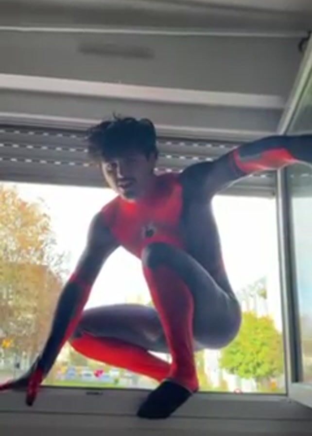 A young man dressed in a Spider-Man costume is crouching on a windowsill inside a building. The window behind him looks out onto a street with trees and cars. He smiles.