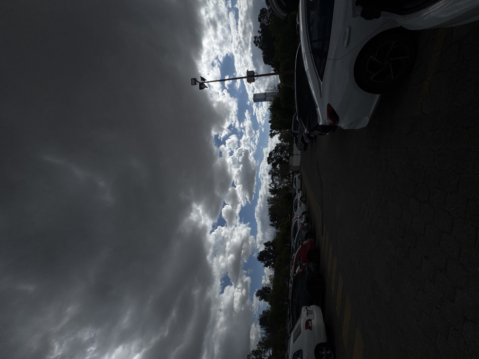 An outdoor shot displays a parking lot filled with various cars under a sky dramatically split between dense, dark clouds and patches of bright, cloud-dotted blue