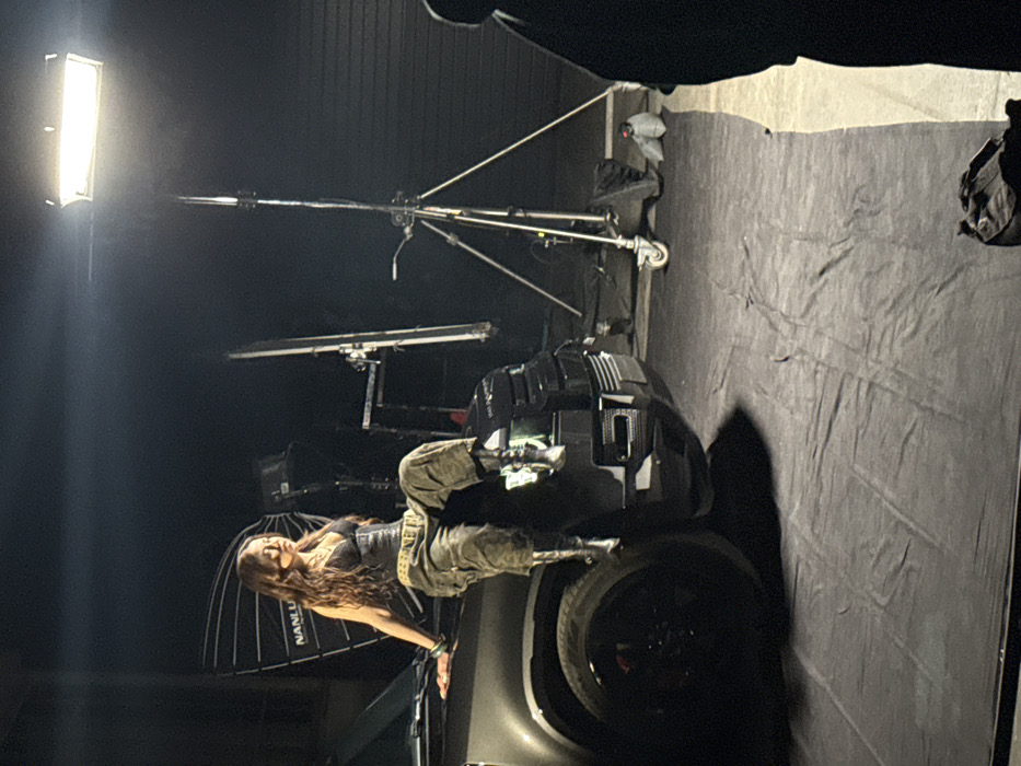 The image captures a nighttime or studio photography session in Ivry-sur-Seine, France. A young adult female, with long wavy brown hair, is prominently featured seated on the front fender and hood of a dark, modern sport utility vehicle, identifiable as a Land Rover Defender. She wears a black strapless corset, olive green cargo pants, and dark boots. Her left arm rests on the vehicle's hood, while her right leg is bent, with her boot positioned near the vehicle's front bumper. The vehicle's left headlight is partially illuminated. The scene is lit by professional photographic equipment, including a large, octagonal softbox bearing "NANLUX" branding, positioned behind and to the left of the woman. To the right, a tall light stand supports a horizontal rectangular LED panel, providing additional illumination. Other light stands, a silver reflector, and sandbags are visible on the ground. The floor is covered by a wrinkled black fabric extending from beneath the vehicle into the foreground. In the lower right corner, the dark, out-of-focus silhouette of a person, likely a crew member or photographer, is visible, facing the scene. A dark bag rests on the black fabric in the immediate foreground. The background is dark, appearing to be a solid wall or garage door.