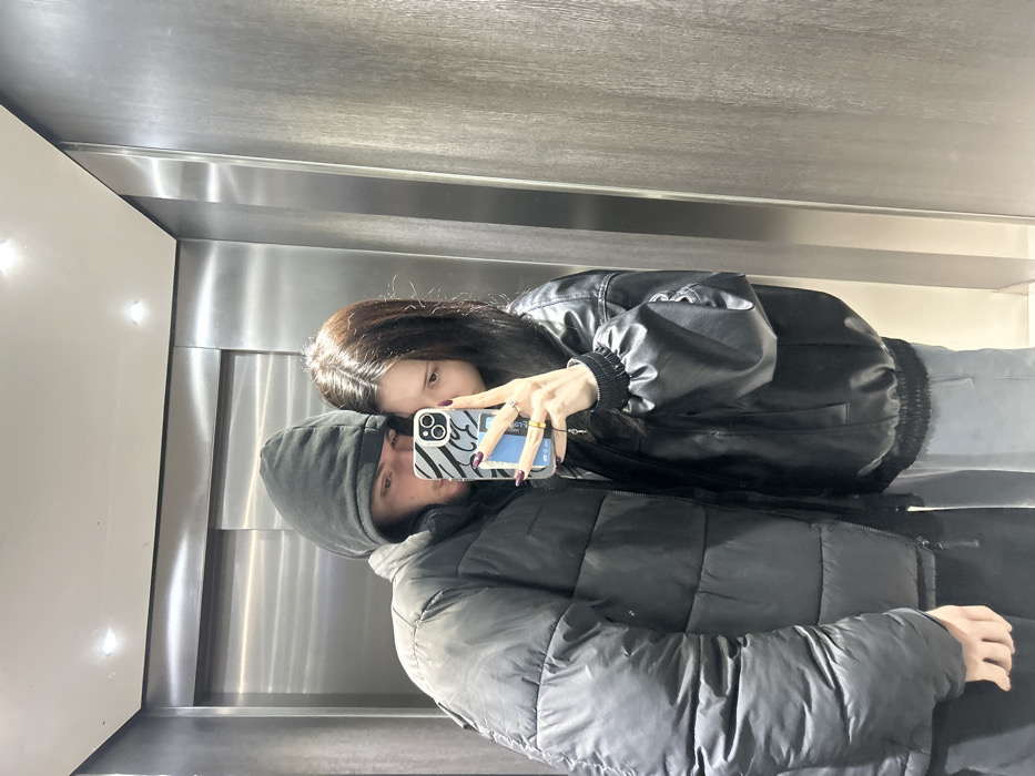 A couple takes a selfie in a mirrored elevator. The woman, positioned behind the man, holds a smartphone with a zebra-striped case adorned with a blue design. She is wearing a black leather jacket and has dark hair. The man wears a hooded puffer jacket. Their reflections show the stainless steel elevator interior. The lighting is bright.