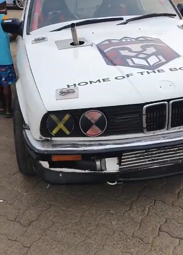 heavily modified white BMW E30 with the words "SCHOOL BUZZ" across the windshield. The hood is emblazoned with a crest-like design and the phrase "HOME OF THE BOY CHILD." A pipe protrudes from the hood and the headlights are covered with tape forming an X pattern. Several people, including a child with a balloon animal, stand around the car. The car is parked on a brick surface.