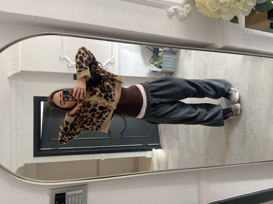 The image depicts a mirror selfie taken indoors within a domestic setting in Welwyn Hatfield, United Kingdom. A single female subject stands centrally, holding a smartphone to capture her reflection in a large, arched-top, silver-framed mirror. She wears a beige and dark brown leopard print fuzzy cardigan over a dark brown fitted tank top, dark grey loose-fitting sweatpants with a visible white and orange waistband, and mismatched athletic shoes (black/red/grey on the left foot, white/grey/black on the right foot). Dark nail polish is visible on her right hand. The reflected background includes a white wall with decorative crown molding, a partially open dark-colored interior door revealing a light floor and a curved white step beyond, a grey wall-mounted intercom/keypad to the left, and a grey wicker basket containing various items including green plastics to the right. A white floral arrangement with green foliage is visible in the lower right foreground. The flooring is a uniform light grey.