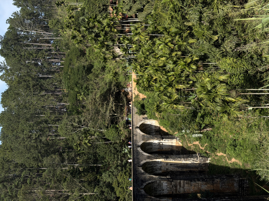 A historic stone viaduct stands amidst lush greenery, likely a bridge for trains or other transportation. The structure features multiple arches and appears well-preserved. The viaduct is surrounded by a dense forest of tall trees, including pines and palms. People are on the bridge. The scene presents a blend of nature and human construction.