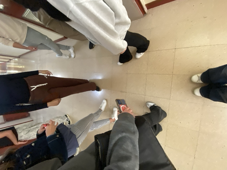 An indoor scene depicts at least seven individuals standing in a brightly lit hallway, identified as a school or institutional building in an Unknown city, Unknown. The perspective is low-angle, looking upwards from near the floor. The immediate foreground features the feet of the photographer, clad in dark pants and white shoes. Surrounding the photographer are six other individuals, primarily visible from the waist down. - To the left: A person wearing a dark blue denim jacket over a light blue shirt, black and white striped pants, and white sneakers. This individual holds a small red and white object in their right hand. - Further left background: Lower legs of a person wearing grey camouflage-patterned pants and black-and-white sneakers. - Center-left: A person in a black long-sleeved top, brown wide-leg sweatpants with a white drawstring and a white logo on the left thigh, and black flats. - Center-right: A person wearing a light beige sweatshirt, light grey sweatpants with a white logo on the left thigh, and white sneakers, with their legs crossed at the ankles. - Right foreground: A person in a light grey hooded sweatshirt, black wide-leg pants, and white sneakers. - Right background: Lower body of a person wearing light brown or khaki pants and dark shoes. - A hand holding a mobile phone with a red case or ring holder is visible in the lower-left quadrant of the frame, belonging to an individual partially out of view. The environment consists of a light beige tiled floor with visible grout lines and walls featuring a reddish-brown trim or baseboard, possibly indicating doors or lockers, extending down the hallway. The lighting is uniform and bright, consistent with overhead artificial illumination. All visible individuals are standing without apparent active interaction.
