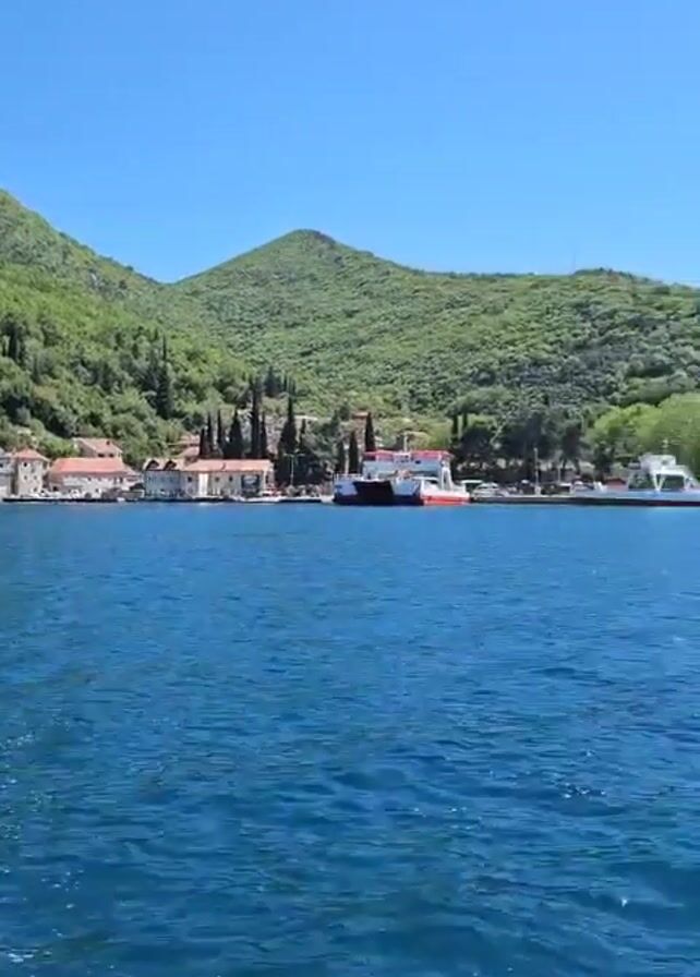 The video depicts a tranquil scene of a body of water, possibly a sea or a large lake, under a clear blue sky. The water is a deep blue color, and the movement of the boat creates a foamy wake. The shoreline is visible in the distance, featuring a cluster of buildings and lush green hills. A ferry is docked at the shore. The overall impression is one of peace and natural beauty.