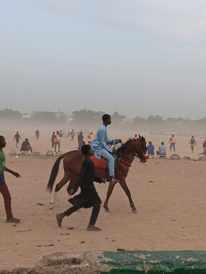 A dusty outdoor scene shows a light-skinned individual riding a brown horse, wearing a light blue outfit, and being led by a person in black clothing. Numerous people are spread across a sandy area, some in athletic wear and others in casual clothes. A line of tires forms a boundary in the background. The sky is overcast, contributing to the dusty atmosphere.