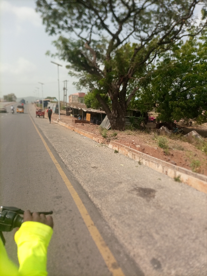 The image presents a roadside scene in Adankolo, Nigeria, viewed from a low, first-person perspective, likely from a moving vehicle. The lower-left foreground shows a left hand clad in a bright yellow sleeve, gripping a dark handlebar. A two-lane asphalt road with a solid yellow dividing line extends into the background, sloping gently upward. To the right of the road, a concrete curb separates the asphalt from a gravel shoulder. Beyond the shoulder, a series of at least six makeshift commercial stalls, constructed from corrugated metal, wood, and various tarpaulins, line the roadside. Several large, leafy trees partially obscure these structures. A single individual, dressed in dark clothing and carrying a backpack, walks away from the viewer on the dirt shoulder. Further along the road, vehicular traffic includes a yellow auto-rickshaw and two motorcycles. Streetlights with solar panels are visible along the road's edge. The background features indistinct buildings and a hazy sky above a distant incline.
