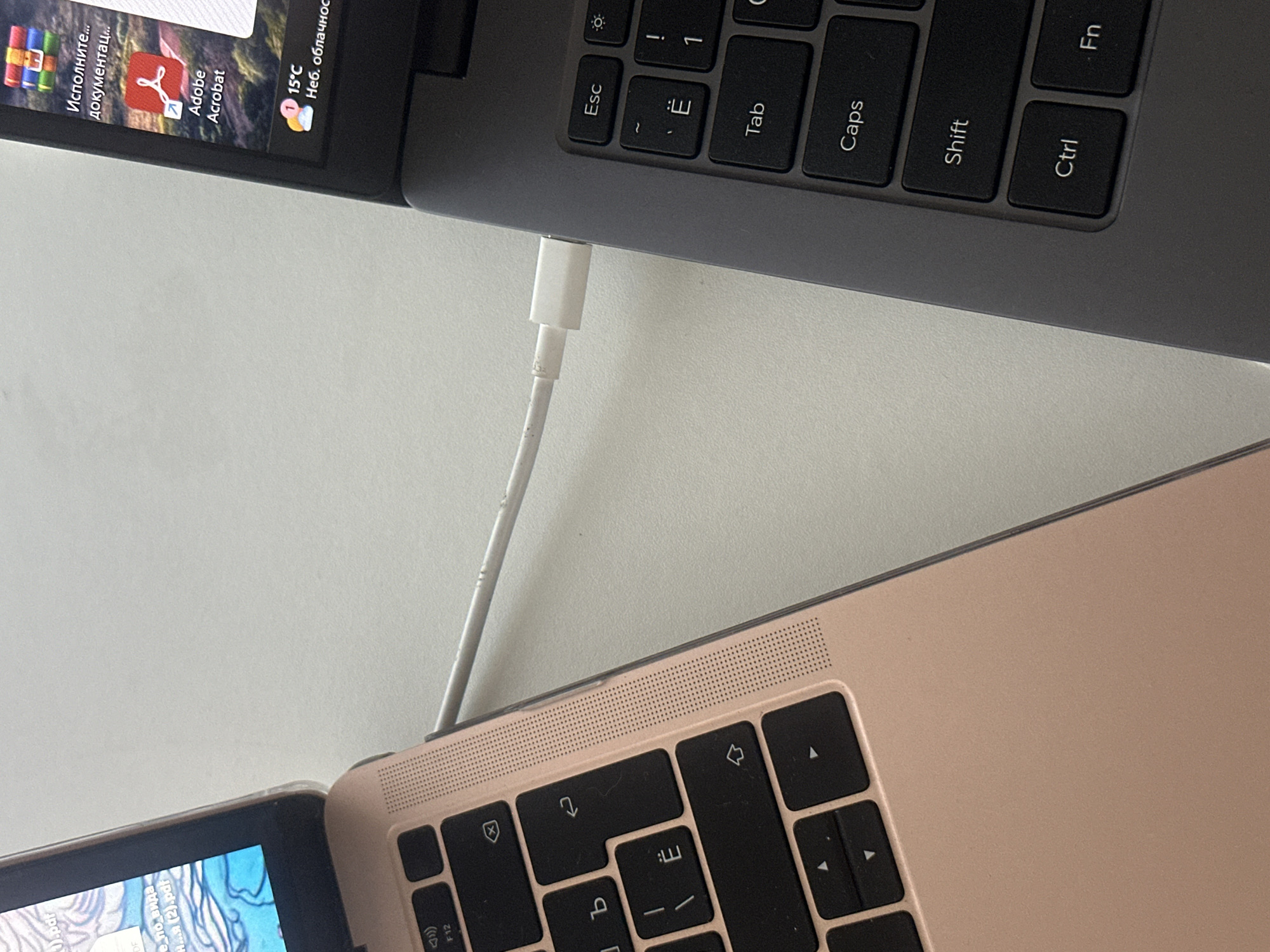 two laptops connected by a USB-C cable. The laptop on the top is a dark gray color and has a keyboard with black keys. The laptop on the bottom is a rose gold color and also has a keyboard with black keys. The screens of both laptops are partially visible. The screen of the dark gray laptop shows some icons, including "Adobe Acrobat" and some Russian text. The screen of the rose gold laptop shows a map. The background is a plain, light-colored surface. The image appears to be taken indoors.