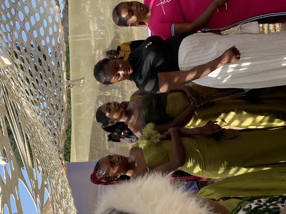 The scene depicts an outdoor gathering in Kuru Dungus, Nigeria, under a light-colored, patterned fabric canopy providing dappled sunlight. In the foreground, four women stand from left to right, facing generally towards the right of the frame. The woman on the far left wears an olive-green strapless gown with a high slit and green feather detailing on the right bodice. Her reddish-brown braided hair is styled in a high ponytail. She holds a black smartphone in her left hand. Next to her, a second woman wears a similar olive-green strapless gown with a darker overlay on the bodice. Her dark hair is pulled back, and she wears teal earrings, holding a small black handbag with a gold chain strap. Both women have neutral expressions and look towards the right. To their right, a third woman wears a black short-sleeved top and a long white pleated skirt, with a pendant necklace. Her head is tilted downwards and slightly to her left. Partially obscured to her right, a fourth woman wears a bright pink short-sleeved top with white lettering and stripes on the sleeves. Her dark hair is styled in distinct cornrows. In the mid-ground, behind the central women, indistinct figures are visible, including a person in a colorful dark top and a man in a yellow and black jacket. The background features a light-colored fabric barrier or tent wall, beyond which green foliage and a clear blue sky are visible.