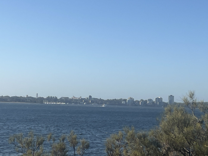 The image displays a panoramic view from Applecross, Western Australia, looking across a wide body of water, identified as the Swan River, towards a distant urban skyline. In the immediate foreground, the upper canopy of sparse, light green and brownish shrubbery is visible along the bottom edge. The midground features a large expanse of deep blue water exhibiting minor surface ripples. A single light-colored vessel is present on the water, moving horizontally from left to right, approximately centered. The background reveals a distant landmass, partially covered by dense green foliage, featuring a distinct urban development. On the far left of the background, a slender, light-colored tower structure rises above the tree line. Towards the center-right, a cluster of multi-story buildings, including several high-rises with rectilinear forms, constitutes a prominent portion of the skyline. The upper two-thirds of the image is dominated by an uninterrupted, clear pale blue sky, devoid of clouds. No people or interactions are discernible.