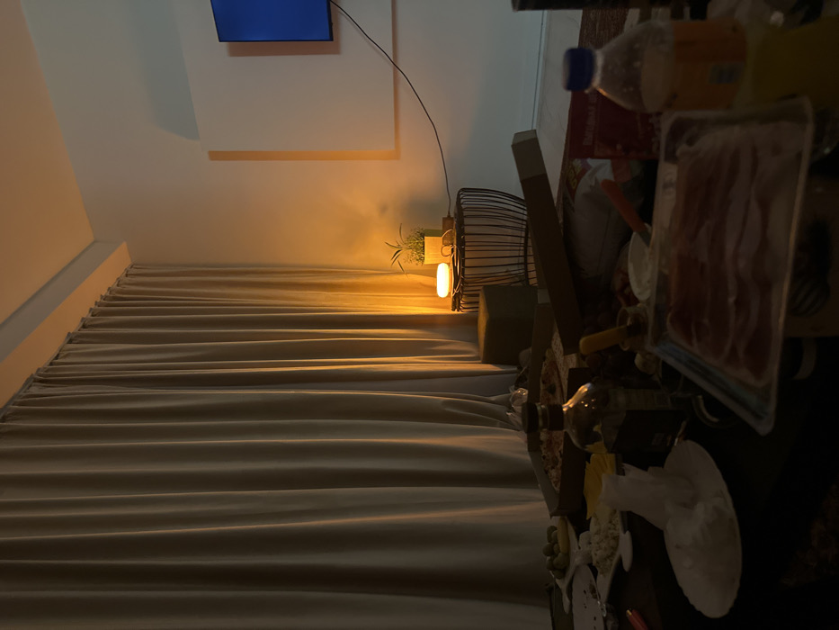 cluttered table in a room with a light fixture casting a warm glow on the curtains. A television is mounted on the wall above. The table is filled with various items, including food platters with cold cuts and appetizers, along with bottles and containers. The overall impression is of a cozy indoor setting with a lived-in, slightly disorganized ambiance.