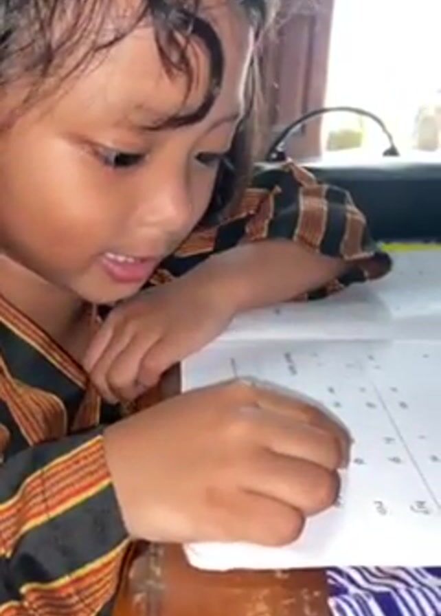 A young girl sits at a wooden table, wearing a patterned shirt. She looks down at a workbook, her finger tracing along the words as she reads aloud. The workbook is open, showing rows of text. A window and other items are visible in the background.