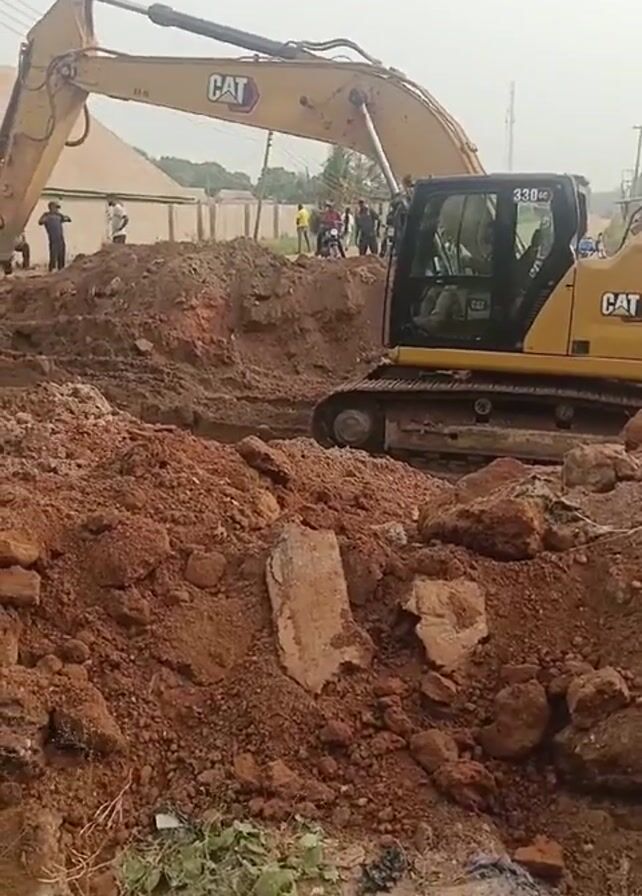 A yellow CAT 330GC excavator is digging in red clay dirt with a group of people standing around watching. The excavator is digging what looks like a trench. There is also a pile of dirt in front of the excavator.