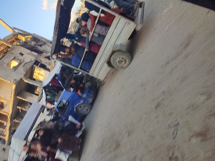The image captures a scene of displacement and devastation. A truck, packed with people, moves along a street lined with severely damaged buildings. A blue car is parked nearby, also likely affected by the destruction. The overall impression is one of a community impacted by conflict or disaster, with people being moved to safety or seeking refuge. The road appears dusty and marked, further emphasizing the harshness of the situation.