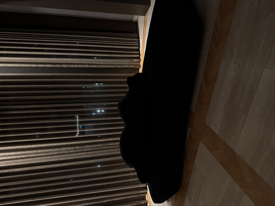 A window with closed horizontal blinds takes up the majority of the frame. Light streaks through the gaps, reflecting off unseen objects. To the right, a dark, amorphous shape obscures the wall and a portion of the floor, which features a geometric pattern of light and dark tiles. The image is dimly lit, creating a stark contrast between the light from the window and the encroaching darkness.