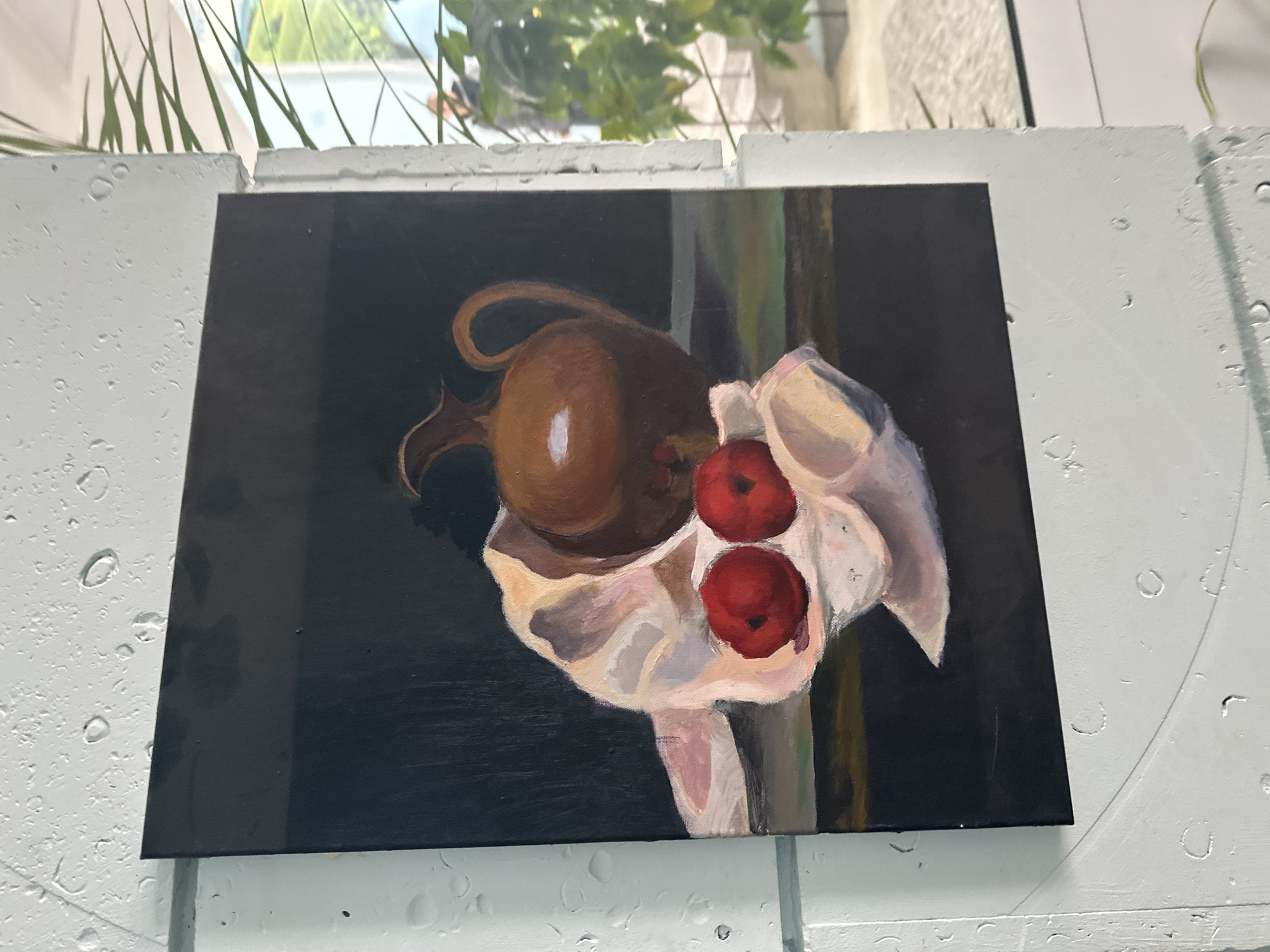 A rectangular oil painting, oriented vertically, is displayed against a textured, light-colored architectural element, likely a wall or pillar segment, in Tutrakan, Bulgaria. The painting depicts a still life against a dark background, featuring a brown ceramic pitcher with a handle and spout positioned on the right, and a crumpled white cloth on the left, upon which two red fruits, possibly apples, rest. A horizontal dark green/brown surface supports these items. The painting exhibits visible brushstrokes. The adjacent light-colored wall features a rough, textured surface with numerous small, irregular raised bumps, resembling dried paint drips. To the right of the painting, an open space or window reveals a brightly lit outdoor environment with lush green plant foliage partially obscuring the view. A blurry human figure is discernible in the distant background, along with indistinct light-colored architectural structures. A thin, dark line, possibly a wire, is visible across the lower left portion of the textured wall.