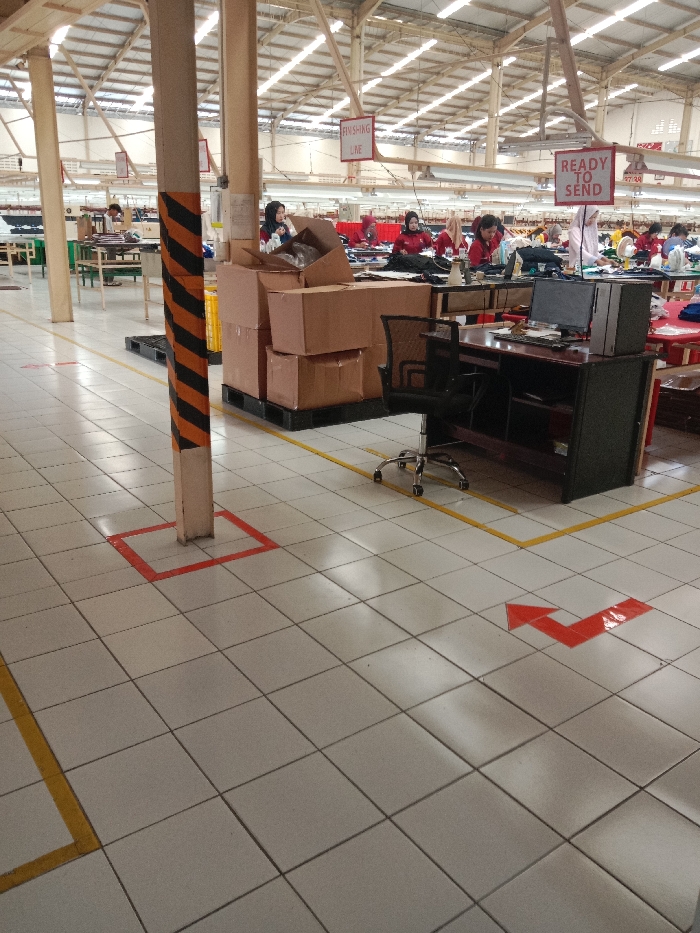 Inside a clothing factory, a beige tile floor displays safety markings, including a red square around a support beam with black and orange stripes, a yellow line, and a red directional arrow