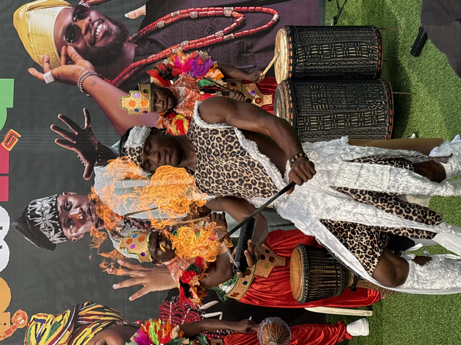 A cultural performance is depicted outdoors in Itirin, Nigeria, featuring three male performers on artificial green turf before a large illustrative banner