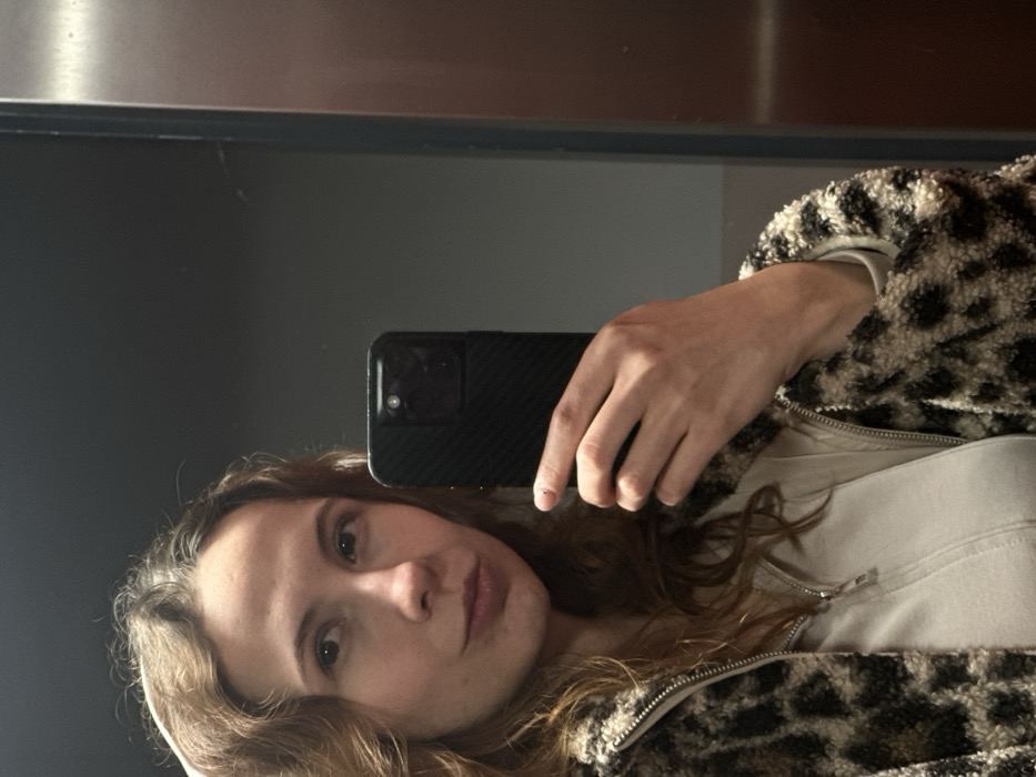 A female individual is depicted taking a mirror selfie inside an elevator, located in Novi Sad, Serbia. She has shoulder-length wavy brown hair with lighter highlights, a light complexion, and brown eyes, with light pink lipstick on her lips. She is wearing a light beige or off-white zippered top beneath a fuzzy leopard print jacket with black and light beige/cream patterns. Her right hand, exhibiting a small red mark near the cuticle of the index finger, holds a black smartphone with a textured case and a prominent rear camera module, positioned to capture her reflection. The background of the reflection reveals a dark grey wall or panel on the left and a brown metallic or wood-paneled surface on the right, separated by a vertical seam, indicative of an elevator interior.