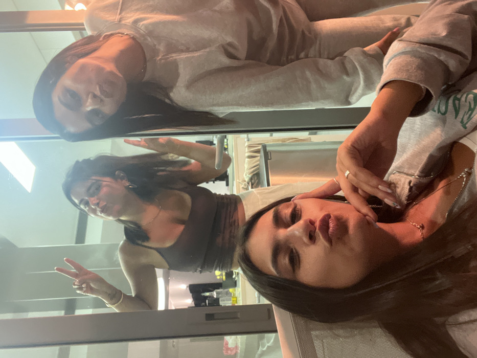 The image displays three young adult females posing for a photograph. The setting is a residential balcony or patio looking into an interior room, separated by a prominent glass sliding door. The location is the city of Ramat Gan, Israel. **People:** 1. **Subject in foreground (left):** A female with long, dark hair is seated, facing the camera. She is wearing a light gray zipped hoodie over a white undershirt. Her left hand is raised to her temple, and she is making a pouting facial expression. A ring is visible on her left ring finger. 2. **Subject reflected in glass (center background):** A female with long, dark hair is visible in the reflection of the glass door, standing indoors. She is wearing a dark brown tank top and light-colored pants. Both her hands are raised, forming "peace" signs, and she is also making a pouting facial expression. 3. **Subject on right (background):** A female with long, dark hair is standing outdoors, to the right of the foreground subject. She is wearing a light gray matching sweatsuit. She is leaning forward and making a pouting facial expression. **Objects and Environment:** A large glass sliding door serves as a partition between the outdoor and indoor spaces. The interior room, visible primarily through the reflection, appears to be a modern kitchen or living area. Visible items include stainless steel appliances (possibly a refrigerator or trash receptacle), light-colored countertops, various bottles (one resembling olive oil, another a clear alcohol bottle), and some containers or boxes. Overhead artificial lighting is active indoors, illuminating the space and casting a warm glow. The scene appears to be set during the evening or nighttime. **Actions and Interactions:** All three individuals are actively posing for the camera with similar pouting facial expressions. The subject in the reflection is additionally making "peace" gestures with both hands. Their collective focus is directed towards the camera, suggesting a group selfie or posed photograph.