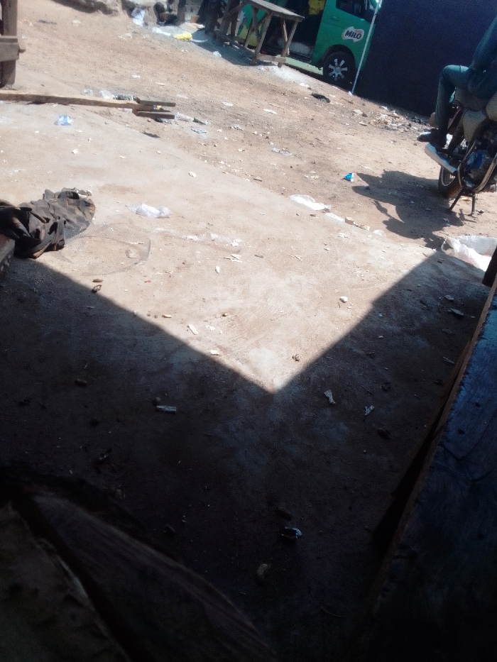 The image depicts an outdoor, unpaved urban area in Nigeria, likely within a commercial or residential zone