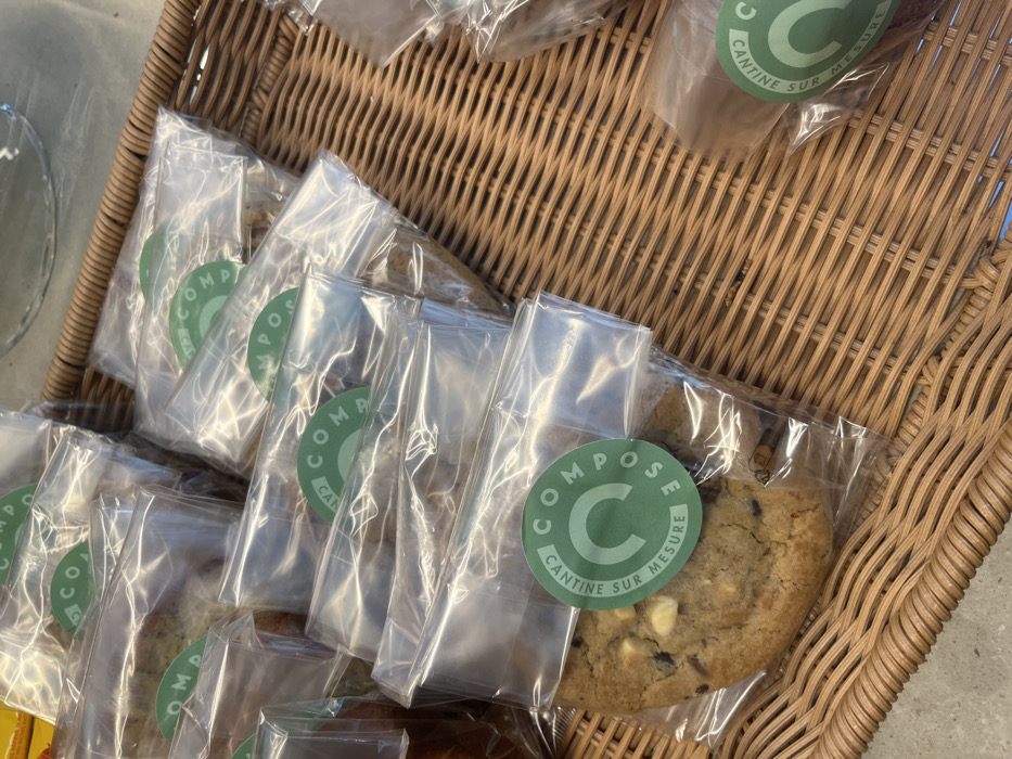 This close-up image displays a collection of individually packaged baked goods, likely cookies or small cakes, arranged in a light brown woven basket. Each item is sealed in a transparent plastic bag featuring a circular green sticker. The sticker prominently displays "COMPOSE" in the center and "CANTINE SUR MESURE" along its perimeter, indicating a custom canteen service. One cookie, visible in the foreground, is a light brown color with scattered dark and white chocolate chips. The items are stacked and layered within the basket, suggesting a display for sale or distribution. The background is blurred, showing indistinct lighter surfaces and a faint reflection, consistent with an indoor setting such as a cafeteria or food service area. Based on the branding, the location is a "Compose Cantine Sur Mesure" facility within Neuilly-sur-Seine, France.