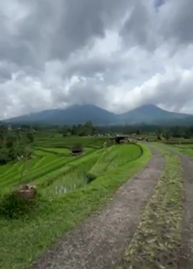 rural scene with rice terraces and mountains in the background. The sky is overcast with heavy clouds. A narrow, dirt path runs through the scene, with green rice paddies on either side. There are small wooden structures dotted across the terraces. In the distance, two mountains are visible, partially obscured by clouds.