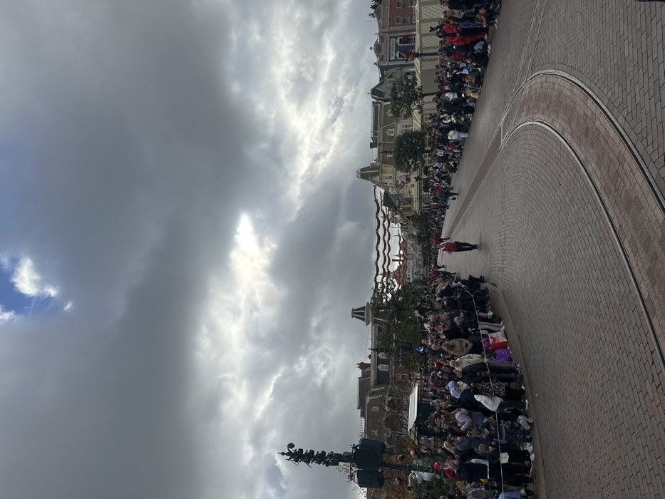 The image captures a wide-angle view of a crowded thoroughfare at Disneyland Paris in Chessy, France, identified as Main Street, U.S.A. The sky is predominantly overcast with heavy grey clouds, though some brighter areas of light penetration and a small patch of blue sky are visible in the upper portion. The street is paved with reddish-brown bricks laid in a herringbone pattern and features two parallel tram tracks curving towards the right in the mid-ground. Victorian-style buildings with multiple stories, varied rooflines, and muted color palettes line both sides of the street. Red and white holiday garlands are strung horizontally across the street between buildings in the distance. Dense crowds of people, comprising adults and children, are gathered along both edges of the street, positioned behind dark rope barriers. They face towards the center of the street, looking into the distance. Individuals are dressed in casual attire, many wearing outerwear consistent with cooler weather. Some are holding mobile phones, seemingly observing or documenting an event. One male figure in a red vest, white shirt, and dark trousers walks away from the viewer down the center of the street. On the far left, a tall dark pole equipped with multiple black speaker-like units or cameras extends vertically into the frame. The scene indicates anticipation for a parade or similar scheduled event.