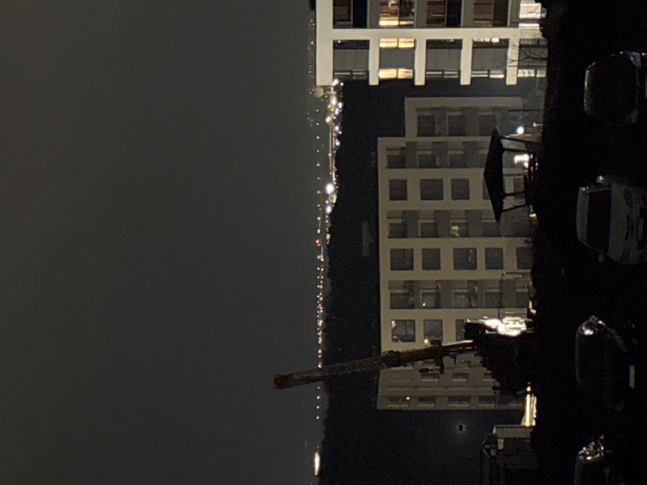 This image captures a nighttime urban scene in Burgas, Bulgaria. In the foreground, the upper portions of three parked vehicles (one dark, one light-colored, one dark) are visible against a dark, unlit ground. The midground is dominated by a tall, dark construction crane with its boom angled upwards and to the left. Behind the crane stands a multi-story residential building with a light-colored facade, featuring numerous rectangular windows and balconies, some of which are illuminated. To the right of the crane, a dark gazebo-like structure with a pointed roof is visible, with a single light source inside. Further to the right, a second, modern multi-story building with a white facade and distinct vertical and horizontal architectural elements is partially visible, showing illuminated windows on its upper floors. Dark, indistinct vegetation is present between the structures and in the background. The horizon line in the far distance presents a scattered array of faint artificial lights, suggesting a distant city, port, or coastline, likely along the Black Sea. No individuals are identifiable, and no discernible actions or interactions are taking place.