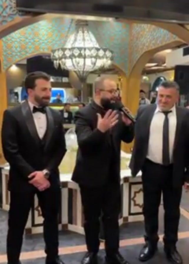 Three men are standing together indoors, likely at an event or restaurant. All three are dressed formally in dark suits. The man in the center is holding a microphone and speaking. He is wearing glasses and a beard, and gestures with his hands while he talks. The man to his left is smiling and looking towards the speaker. The man on the right has his hands clasped in front of him. Behind them is a fountain structure, with people visible in the background. The interior has ornate architectural details, including patterned tiles and a decorative chandelier.