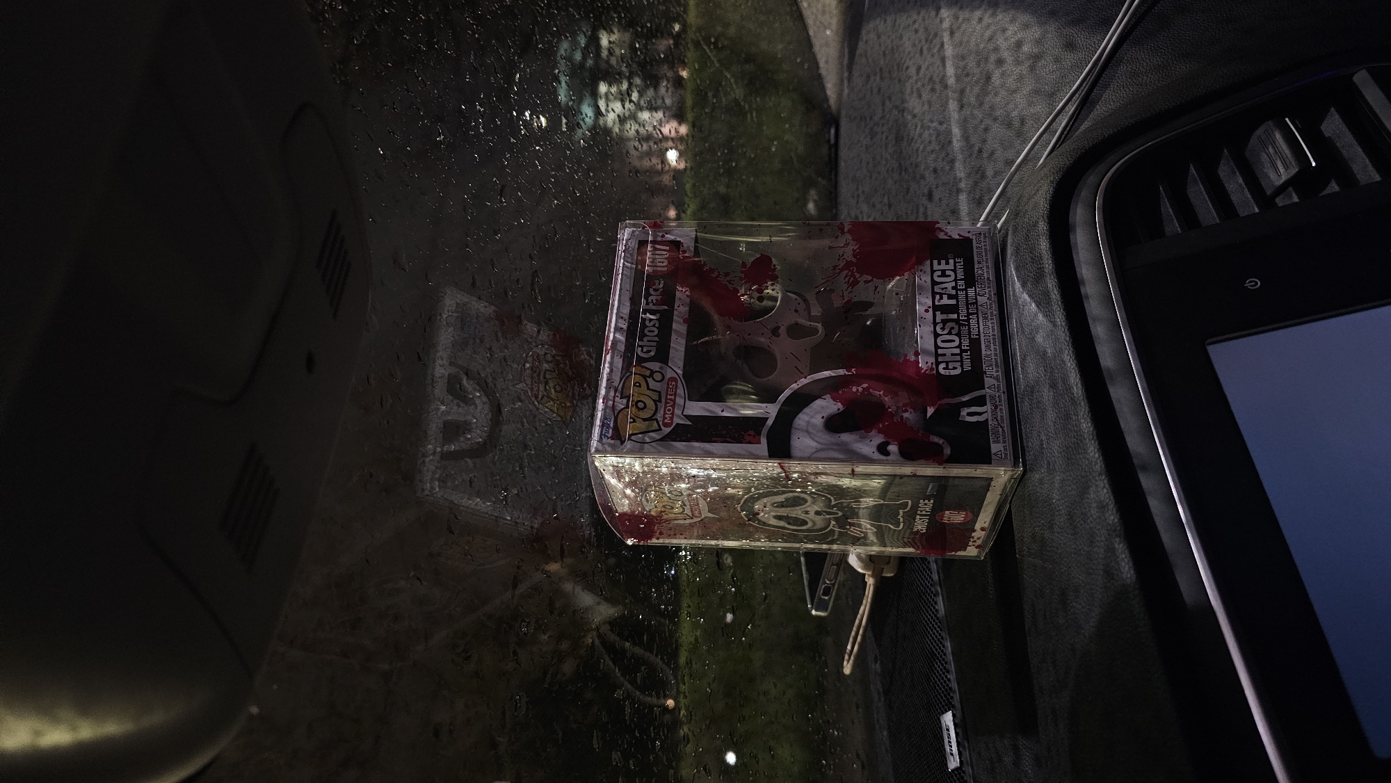 bloodied Ghostface Funko Pop figure inside its packaging, placed on the dashboard of a car