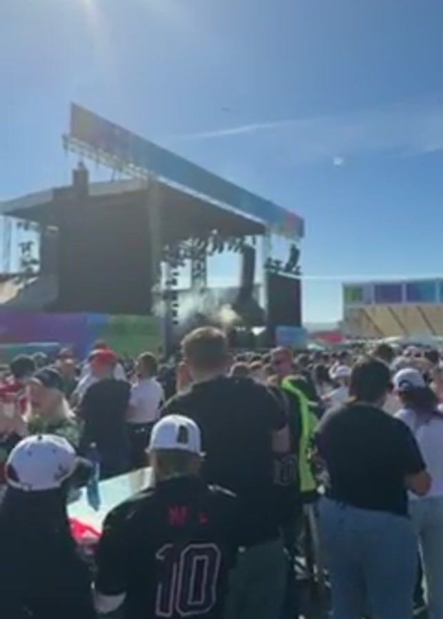 crowded outdoor event on a sunny day. In the foreground, a crowd of people stand with their backs to the camera, many wearing casual clothing, and some wearing sports jerseys and hats. In the center of the frame, a large stage structure is visible with lighting rigs and speakers. Smoke or fog emanates from the stage area. A sign reading "Super Bowl LX, San Francisco Bay Area" is visible on the structure. In the background, a building resembling a stadium is partially visible. The camera zooms in slightly toward the stage.