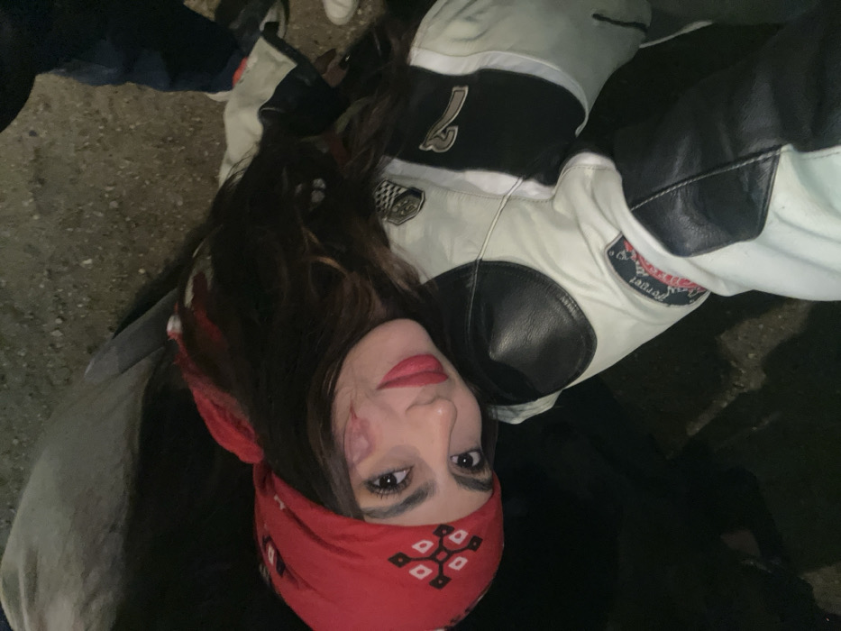 A medium close-up, angled image depicts a young female subject in an outdoor, low-light setting within Paris, France. The subject has long, dark hair, partially covered by a red bandana adorned with white geometric patterns. Her face is turned towards the camera, displaying a slight smile, dark eyebrows, prominent eyelashes, and red lipstick. A light-colored mark or scar is visible on her left cheekbone. She is wearing a light-colored (off-white/pale grey) leather jacket with black accents on the shoulders and arms. A circular patch with indistinct text, possibly "Pergel," is visible on her right upper arm. The background is dark and indistinct, with a textured ground surface consistent with pavement or concrete. To the right of the primary subject, the lower legs and feet of a second individual are partially visible, clad in blue pants and athletic shoes (one white shoe, one multi-colored with red, white, and blue elements). Illumination appears to be from an artificial light source, possibly a flash.
