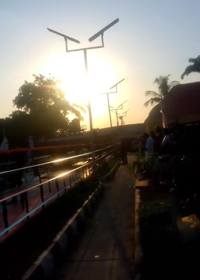 The camera moves along a path with black and white curb stones and a metal handrail with blue and red paint, revealing a partially visible scene of what appears to be an outdoor event. The sun is setting, casting a bright glow through trees and structures. A crowd of people are seated in bleachers. There is a large building behind them, possibly a stadium or event hall. A basketball hoop is visible in the background. A tent structure can also be seen. The path has solar-powered lamps along it. The sky is blue and clear. The video ends before providing a comprehensive view of the entire event space.