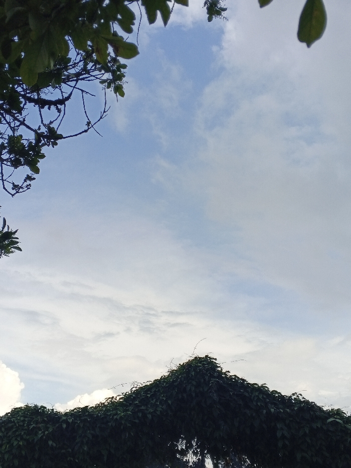 The scene is an outdoor view in the city of Akshatau, Kazakhstan, primarily depicting the sky and plant life. The upper two-thirds of the frame features a light blue sky interspersed with scattered white, thin clouds, indicating daylight conditions. Dark green tree branches with leaves extend into the frame from the top left corner, and a few leaves are visible at the top right. The lower third of the image is occupied by a dense, dark green mass of foliage, forming an uneven, undulating horizon. This foliage, likely a large shrub or vine growth, has some lighter green tendrils extending upwards from its main body. No human figures, animals, or artificial structures are present.