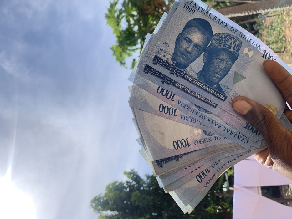 - "This outdoor scene, set in Jos, Nigeria, features a dark-skinned human hand holding a fanned stack of approximately 8-10 Nigerian 1000 Naira banknotes" by FM-BqndE3, licensed under CC BY 4.0