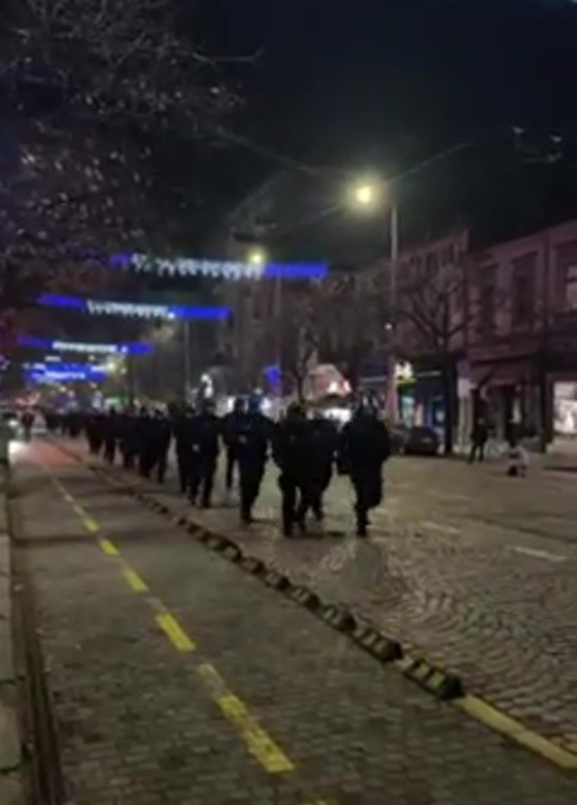 At night, a large group of law enforcement officers dressed in black uniforms and riot gear are seen running down a cobblestone street. The street is divided by a yellow line. Above the street, holiday lights hang between buildings. Several cars are parked on the side of the street.