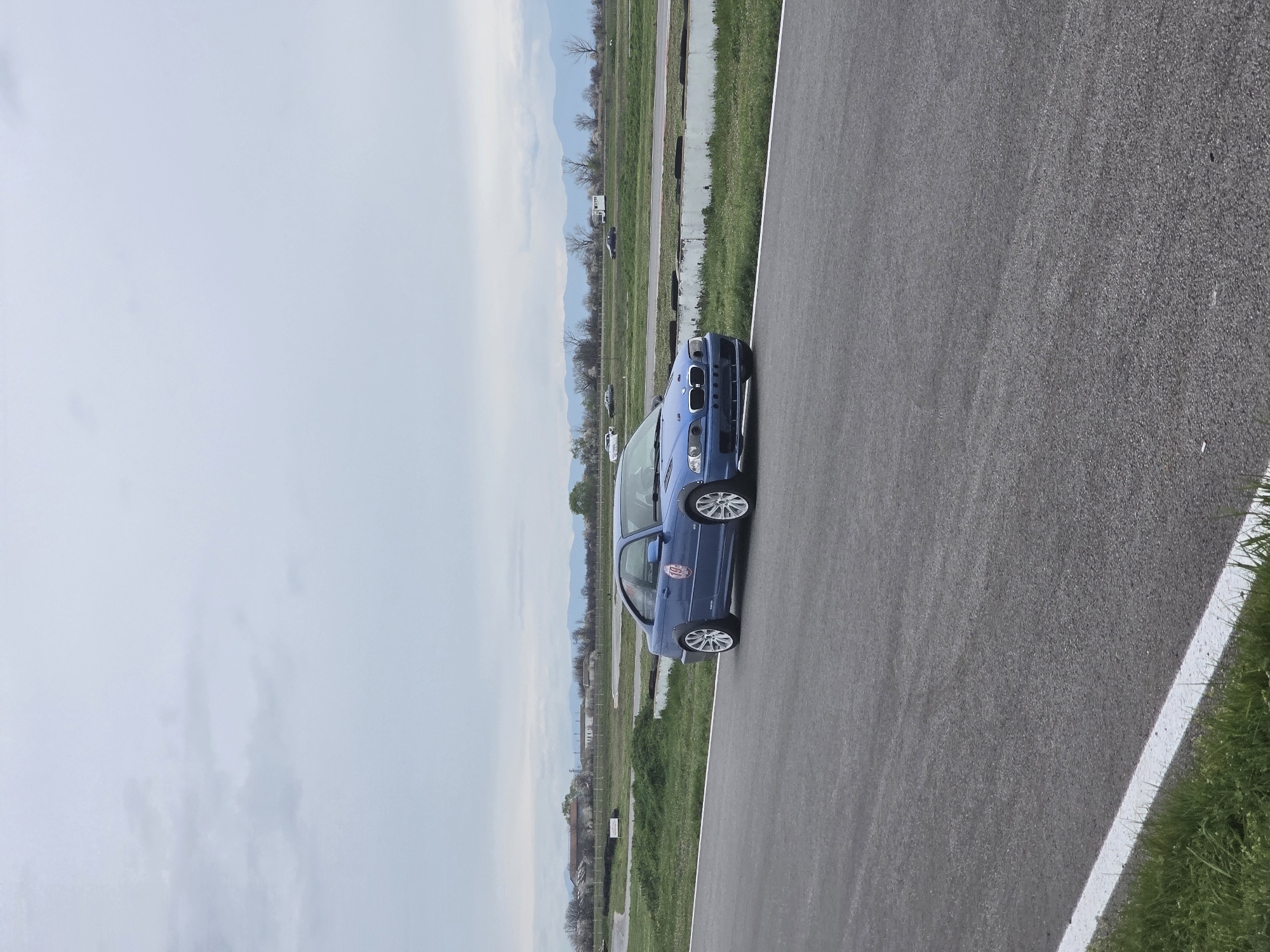 A blue passenger car is positioned on an asphalt race track next to a white painted track boundary line and a grassy verge. In the background is open agricultural land in the city of Kaloyanovo, Bulgaria under an overcast sky.