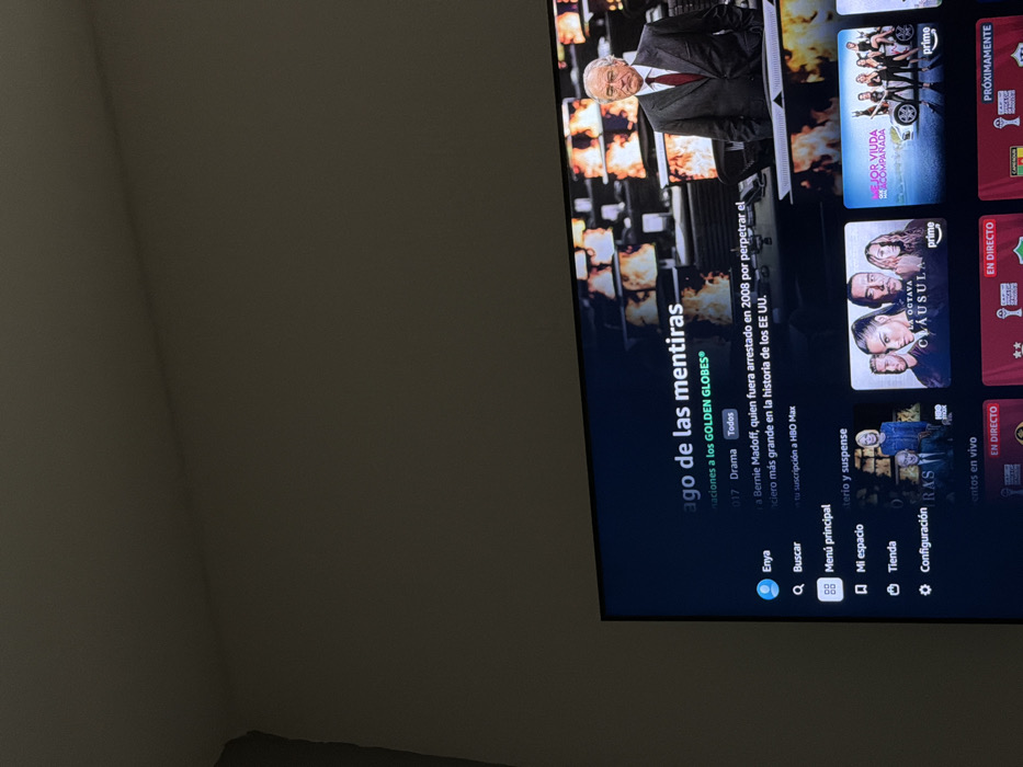 A television screen displays the Amazon Prime Video interface. The featured show is "El Juego de las Mentiras," a drama about Bernie Madoff's 2008 arrest for financial crimes. Various menu options are visible including "Buscar" (Search), "Menú principal" (Main Menu), "Mi espacio" (My Space), "Tienda" (Store), and "Configuración" (Settings). Other titles are also displayed, including "La Octava Cláusula" and "Mejor Viuda Acompañada." Some sections on the right are labeled "En Directo" (Live) and "Próximamente" (Coming Soon).