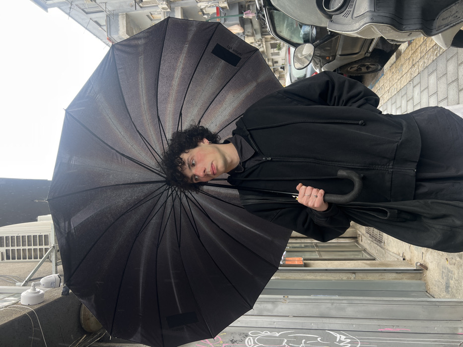 A young individual is depicted from the waist up, standing on a tiled sidewalk under a large, open black umbrella on an overcast day in Tel-Aviv, Israel