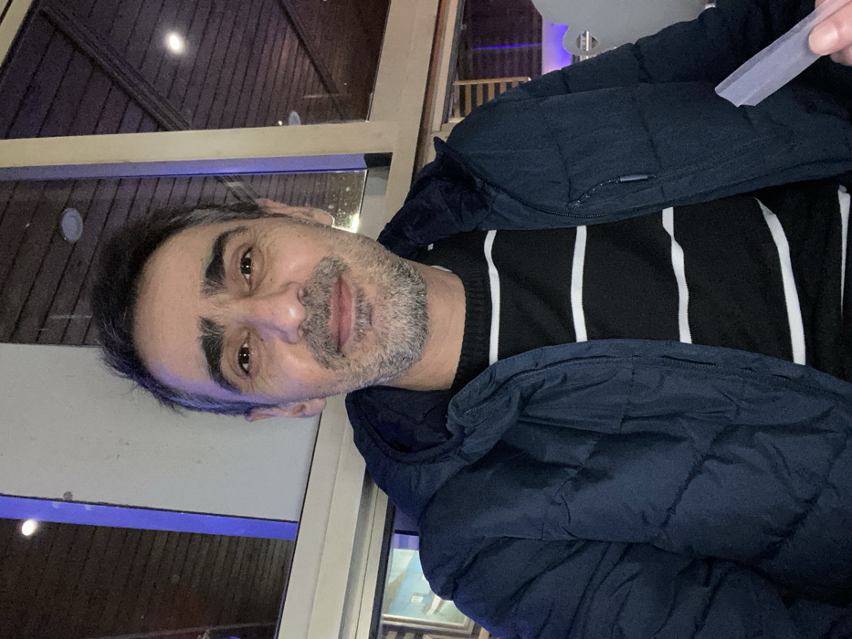 A middle-aged man with graying hair and a salt-and-pepper beard looks directly at the camera. He's wearing a black and white striped sweater and a navy blue puffer jacket. He is positioned near a window with a dark background, possibly indoors. In the upper right corner, a hand holds a clear, rectangular object. The lighting is dim, adding a casual atmosphere to the picture.