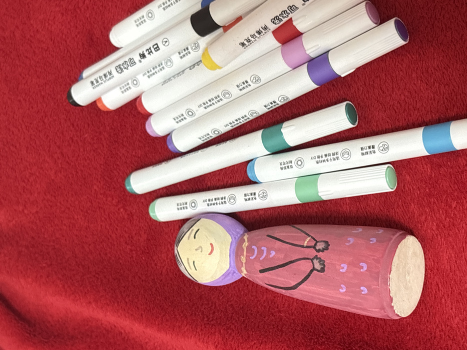 collection of white-bodied acrylic markers with colored caps in black, orange, yellow, red, purple, teal, and light blue. The markers are arranged on a red fabric surface. Next to the markers is a painted wooden doll with a purple head covering, a pink dress, and simple facial features. The doll is lying on its side.