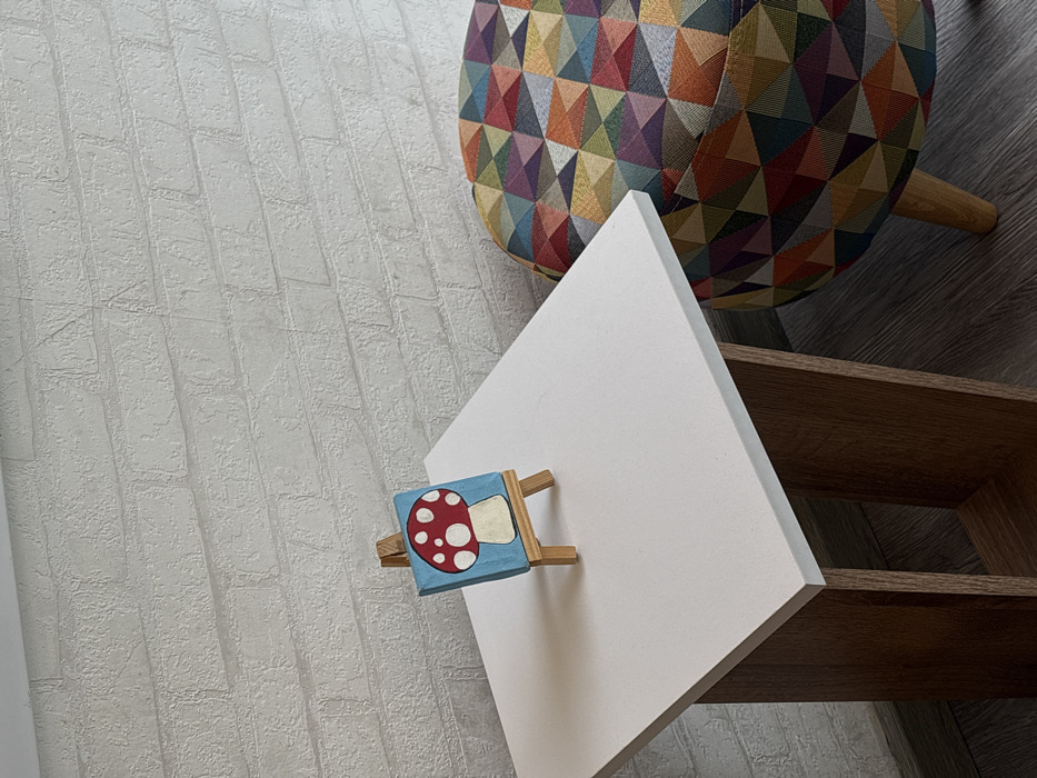 The image depicts an indoor scene with a minimalistic arrangement. A textured light grey wall, resembling whitewashed bricks, serves as the background. The floor is composed of dark grey wooden planks. A white-topped, rectangular side table with a brown wood-grain base is positioned centrally on the left. On the table's surface, a small, light-brown wooden easel stands upright, supporting a miniature square painting. The painting features a stylized mushroom with a red cap, prominent white spots, and a light brown stem, all set against a sky-blue background. To the right of the table, a round upholstered pouf or stool is partially visible. It is covered in a fabric patterned with a tessellation of multi-colored triangles in hues of orange, blue, green, yellow, maroon, and grey. A single light-colored wooden leg is visible beneath the pouf. No individuals are present. The specific location within the city of Bogota, Colombia, is not discernible from the visual information provided.