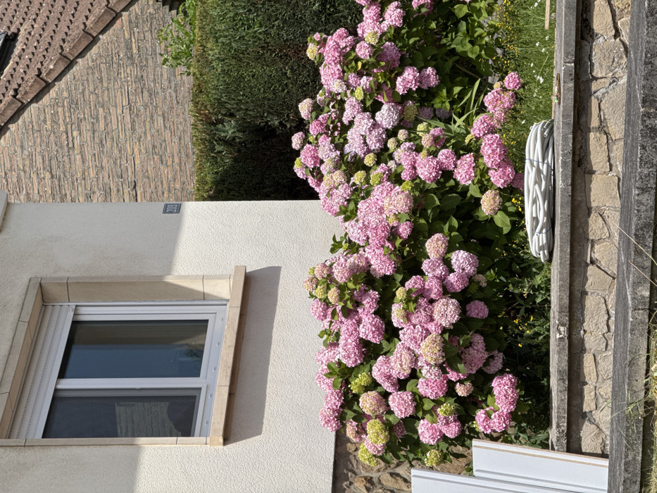 A vertical shot reveals a building with a brick roof and a white wall. A window with a white frame is visible. Next to the wall, a lush hydrangea bush with pink blossoms grows, bordering a tall, gray stone wall. A coiled white hose hangs on the wall. Green foliage is scattered.